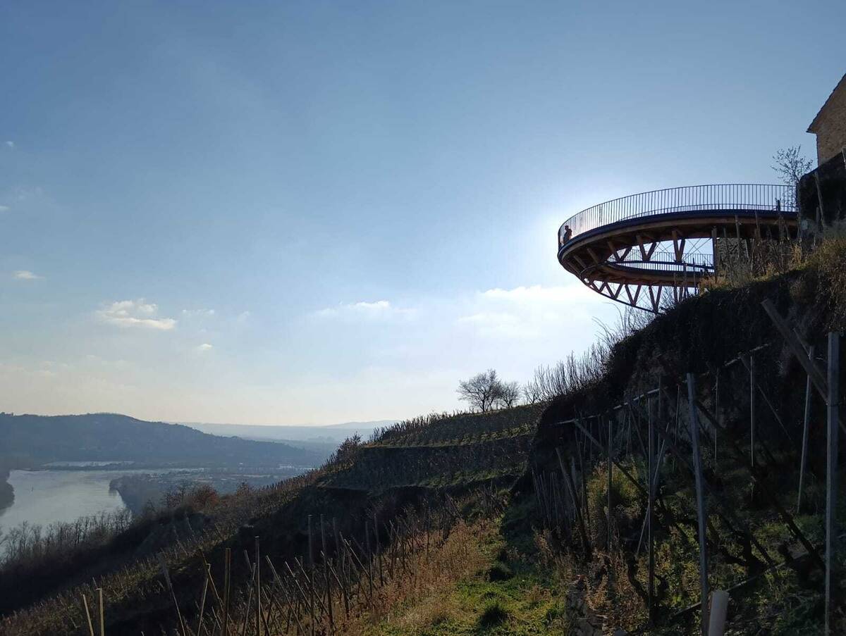 La montée sera un peu rude, mais vous pourrez faire plusieurs haltes près des panneaux d’interprétations vous indiquant les différentes étapes du travail de la vigne, les différents cépages cultivés sur ces terrasses et les histoires relatant les différentes crues.