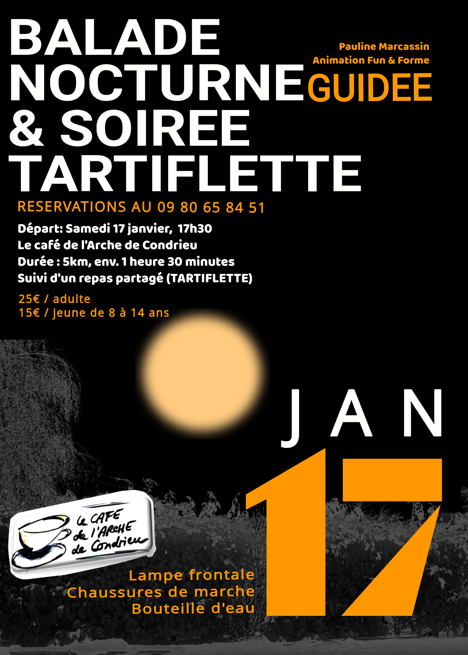 Balade nocturne guidée, suivie d'un repas partagé (tartiflette), organisée par le Café de L'Arche et l'Animation Fun & Forme.