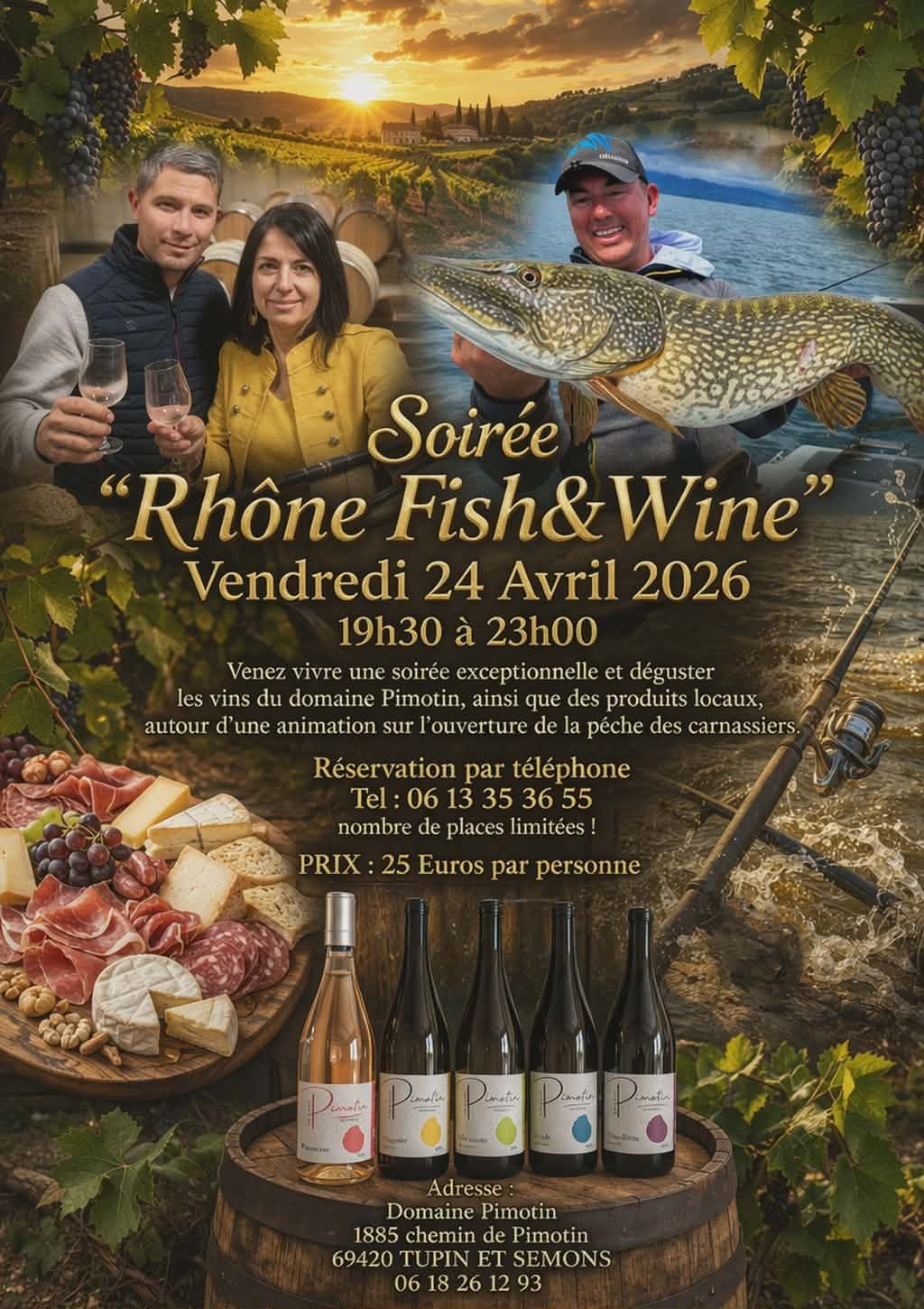 Venez vivre une soirée exceptionnelle et dégustez les vins du Domaine Pimotin, ainsi que des produits locaux, autour d'une animation sur l'ouverture de la pêche des carnassiers.